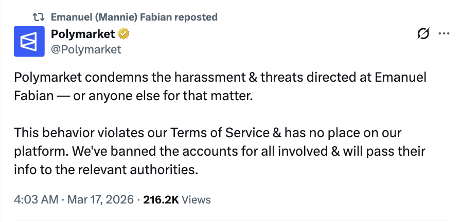 Polymarket 回應稱,平台譴責針對 Emanuel Fabian 的騷擾與威脅,並表示這種行為違反服務條款,預測市場依賴獨立報導的完整性,任何試圖施壓記者改變報導的行為,不僅破壞新聞,也破壞市場本身。這一表態在原則上無可爭議,因為若市場價格依賴的是外部事實來源,那麼對事實供給者施壓,本身就是對市場誠信的直接侵蝕。