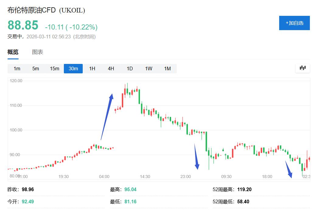 市場數據顯示,布倫特原油週一日內最高觸及119.50美元,最低跌至83.66美元,單日振幅創有史以來最大紀錄。反映油市波動率的指標當天接近2020年以來最高水平。
