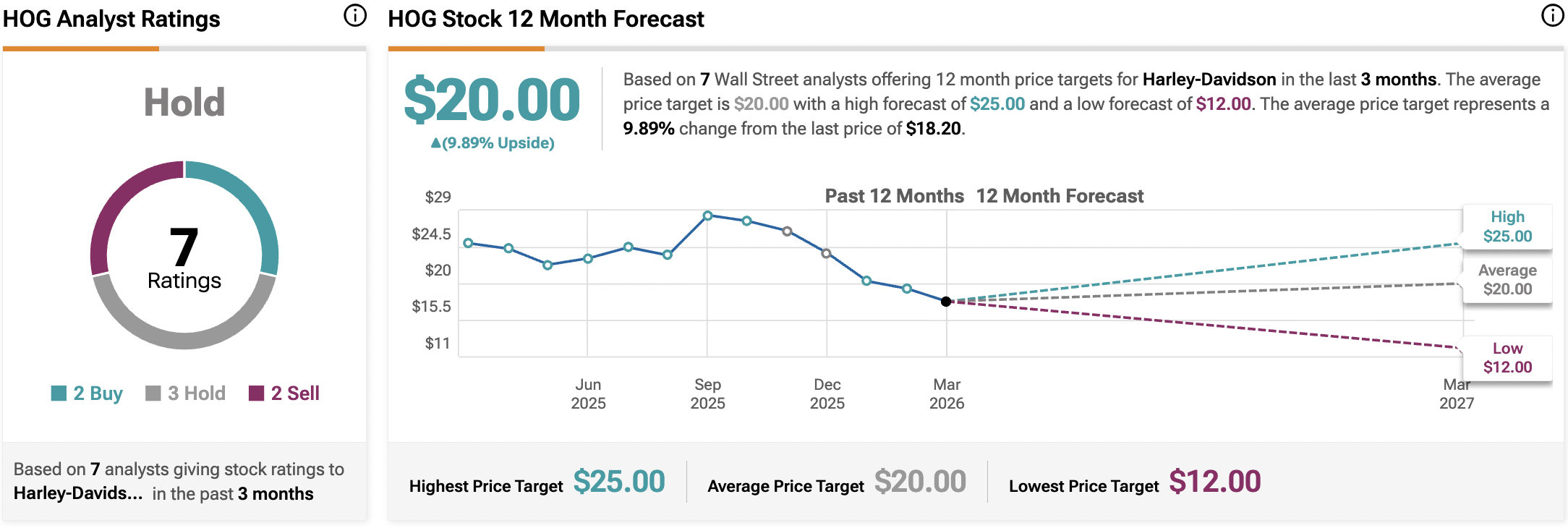 根據過去三個月內七位華爾街分析師的數據,哈雷-戴維森(HOG)股票的共識評級為持有(Hold),其中包括2個買入(Buy)、3個持有(Hold)和2個賣出(Sell)評級。
