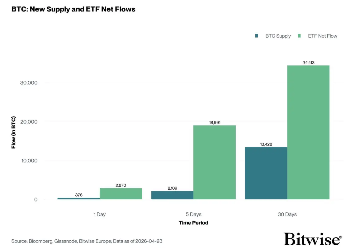 ChainCatcher 消息,據 Bitwise 數據,美國現貨比特幣 ETF 在過去 5 個交易日內共吸納 18,991 枚 BTC,為同期挖礦新增供應量(2109 枚 BTC)的 9 倍。