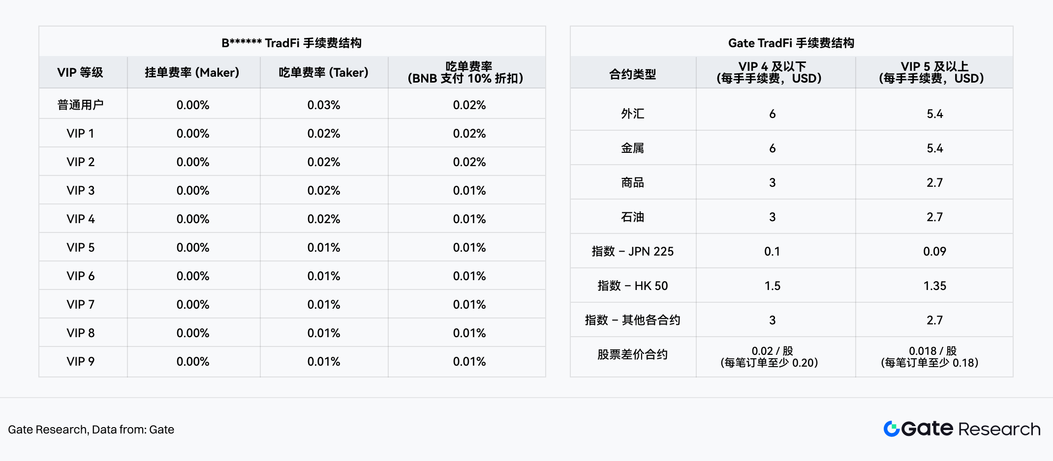在 TradFi 相关产品中,Gate 与 B****** 在费率设计上采取了截然不同的定价模型,Gate 延续传统 CFD 市场常见的按手固定收费模式,而B****** TradFi Perps 则沿用按名义成交额收取百分比手续费的永续合约体系。