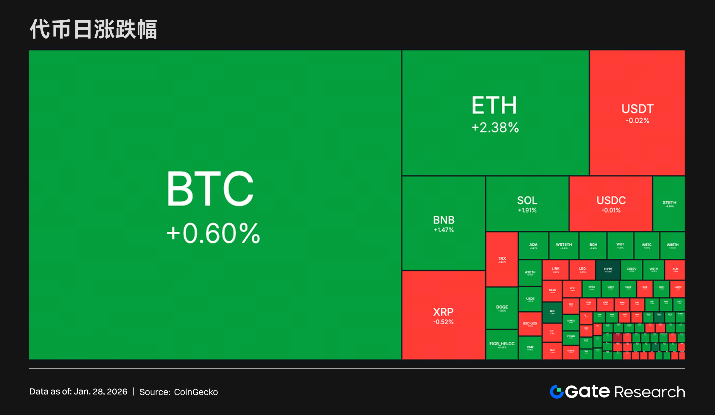 过去 24 小时,加密市场整体呈现修复反弹,盘面以普涨为主,资金主要回流至核心资产与头部主流币种。SOL 等同步走强;稳定币板块则基本持平,小幅波动更多体现为资金在风险资产与现金等价物之间的短期切换。