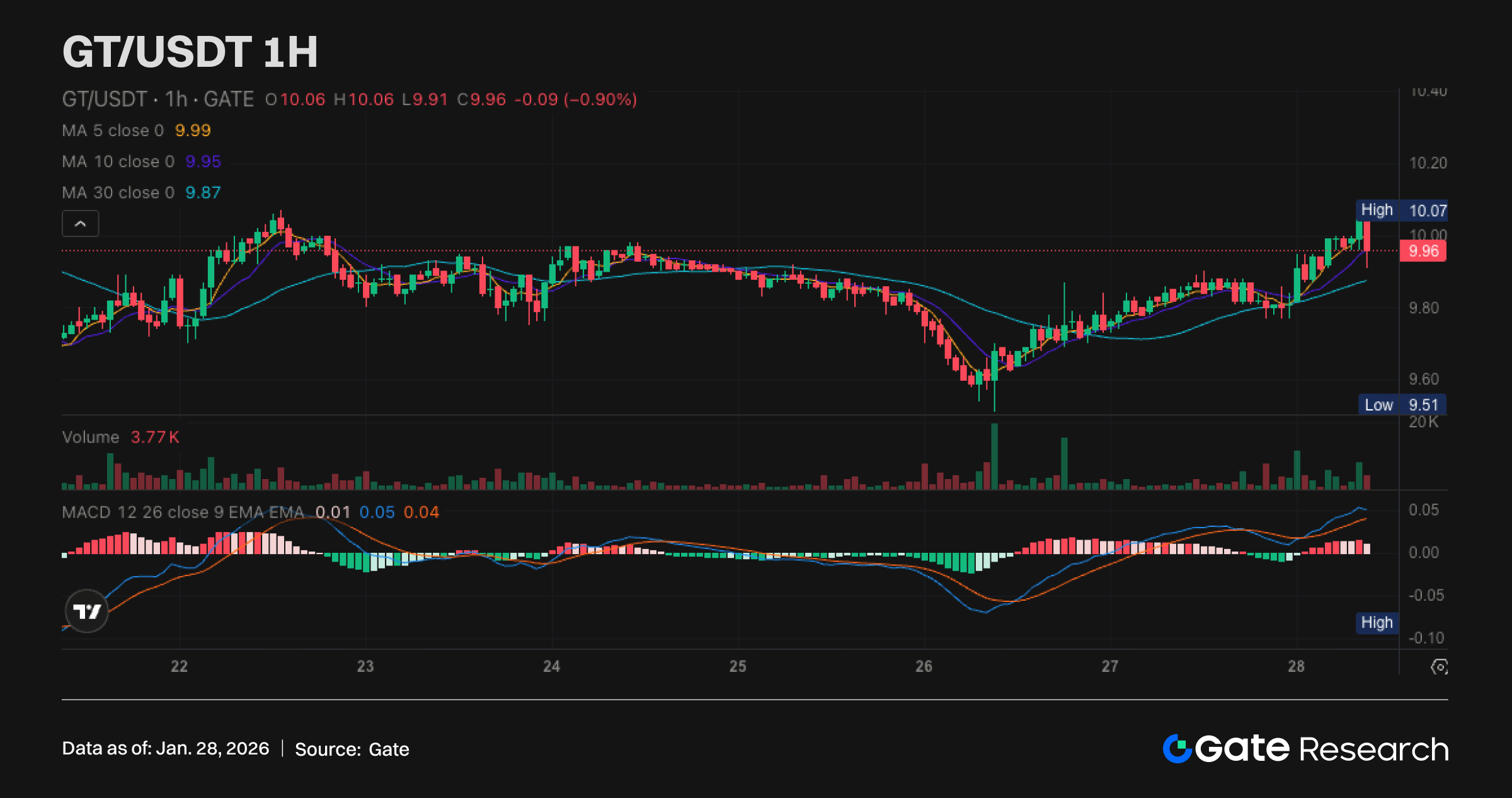 GT 近一日走势相对偏强,价格自 9.60 美元附近修复上行并触及 10.07 美元高点后小幅回落,短线进入高位整理,整体波动幅度仍低于主流币。均线系统由弱转强,MA5 与 MA10 已上拐并贴近上行,价格运行在其上方,同时 MA30 位于下方并开始走平,显示中期压力有所缓解、结构偏向修复。MACD 在零轴附近震荡并维持金叉格局,红柱逐步抬升,短线多头动能占优但需防高位钝化。整体来看,GT 若能企稳并站稳 10.00–10.07 美元区间,有望延续修复并上探更高阻力;反之若回落跌破 9.90 美元,则需关注 9.70–9.60 美元区域支撑的有效性。