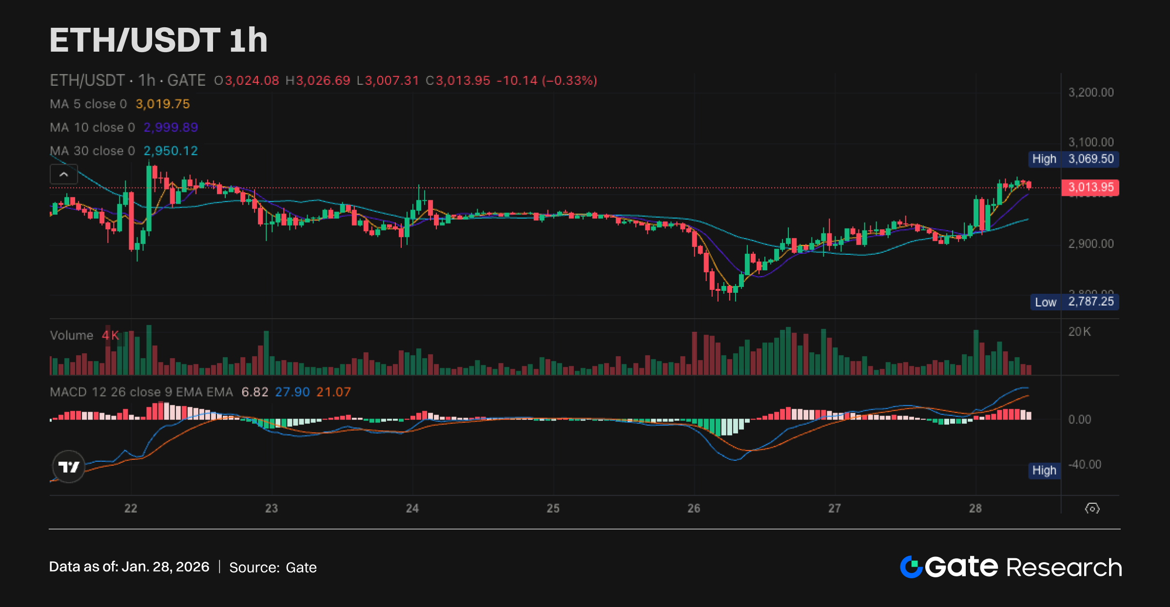 ETH 近一日冲高回落后进入高位震荡,价格围绕 3,000 美元关口反复整理,短线波动较 BTC 更为敏感。均线系统呈现明显走强结构,MA5 上穿 MA10 且两者同步上拐,MA30 也开始抬升,显示趋势由修复转向偏多,但上方仍受到前高区域压制。MACD 位于零轴上方并保持金叉,红柱维持扩张但边际增速放缓,提示多头仍占优但追价动能有所降温。整体来看,ETH 若能守住 3,000 美元并重新上攻突破 3,050–3,070 美元区间,有望打开续涨空间;反之若跌破 2,990–2,950 美元支撑带,则需关注回撤至 2,900 美元附近的承接力度。