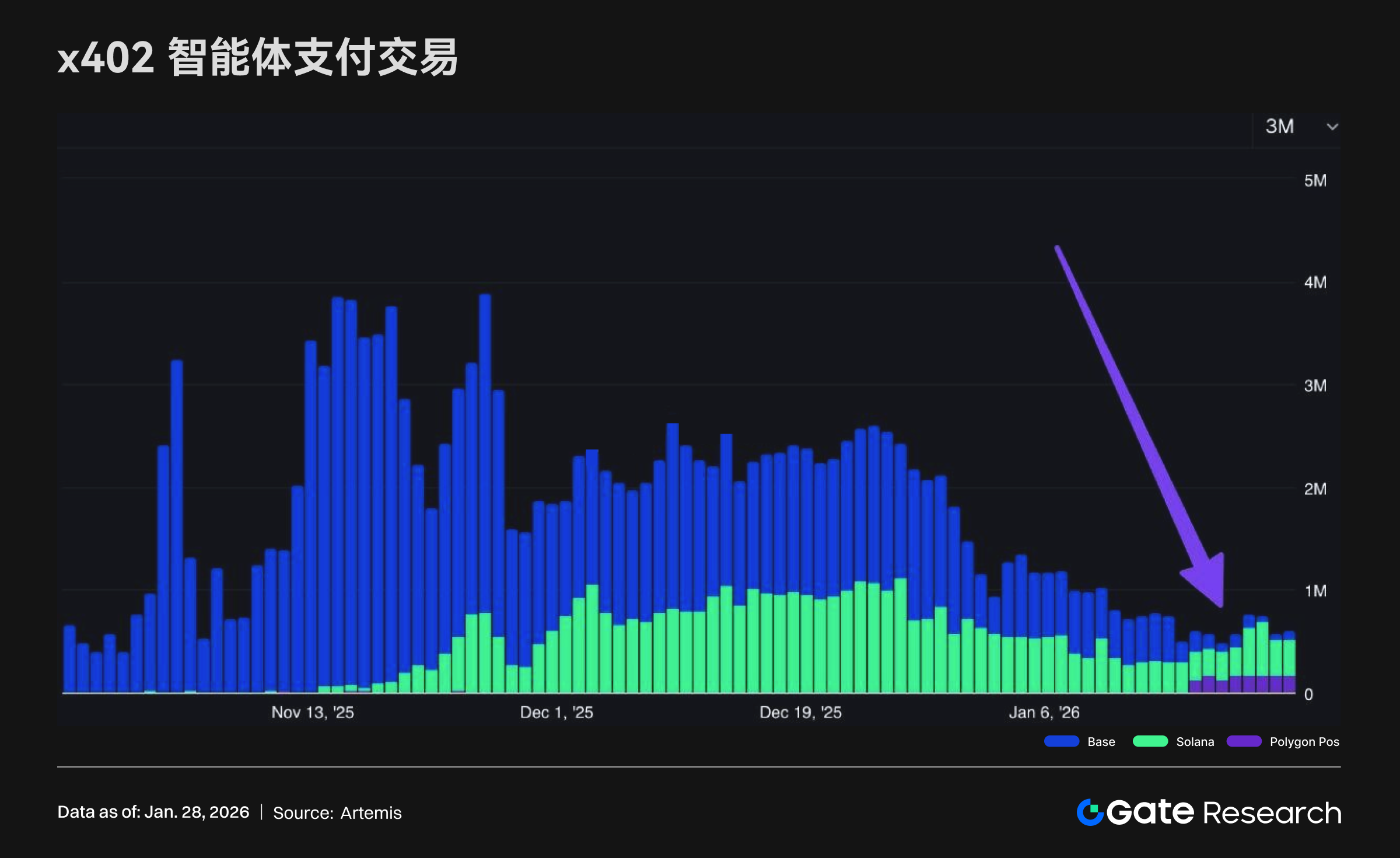根据 Artemis 数据显示,在 x402 智能体支付交易(agentic payment)维度上,Polygon 的日交易量已连续第八天高于 Base。结合近三个月的链上交易结构变化可以看到:早期由 Base 贡献了绝大部分交易量、并在阶段高位后逐步回落;中段开始 Solana 的占比持续抬升,形成“Base 走弱、Solana 走强”的结构性再平衡;而最近一段时间 Polygon 的增量更明显,短期内完成了对 Base 的反超并保持连胜。