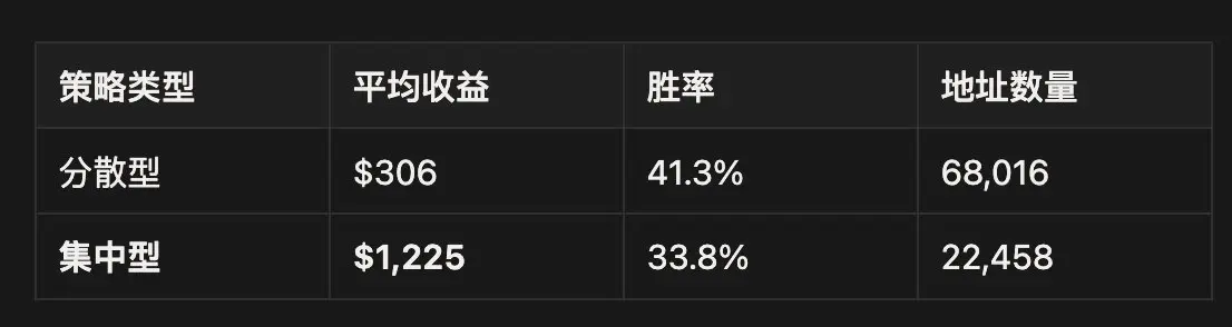**数据解读:**集中型策略的平均收益是分散型的 4 倍。但也出现了一个极具误导性的现象: 集中型策略的胜率(33.8%)反而显著低于分散型(41.3%)。这揭示了预测市场中高阶玩家的真实盈利逻辑。
