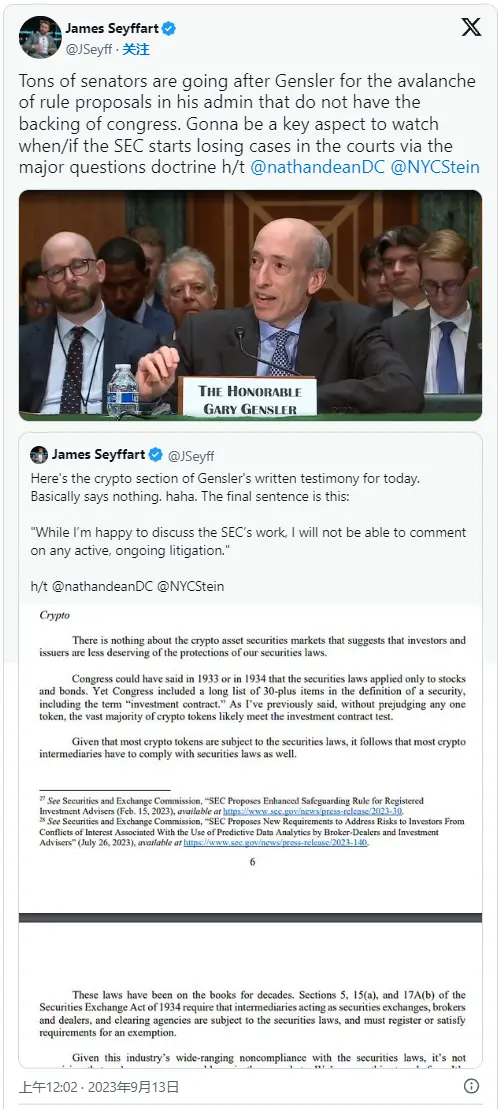 Gensler 在 9 月 12 日向参议院银行委员会提交的书面证词中表示: