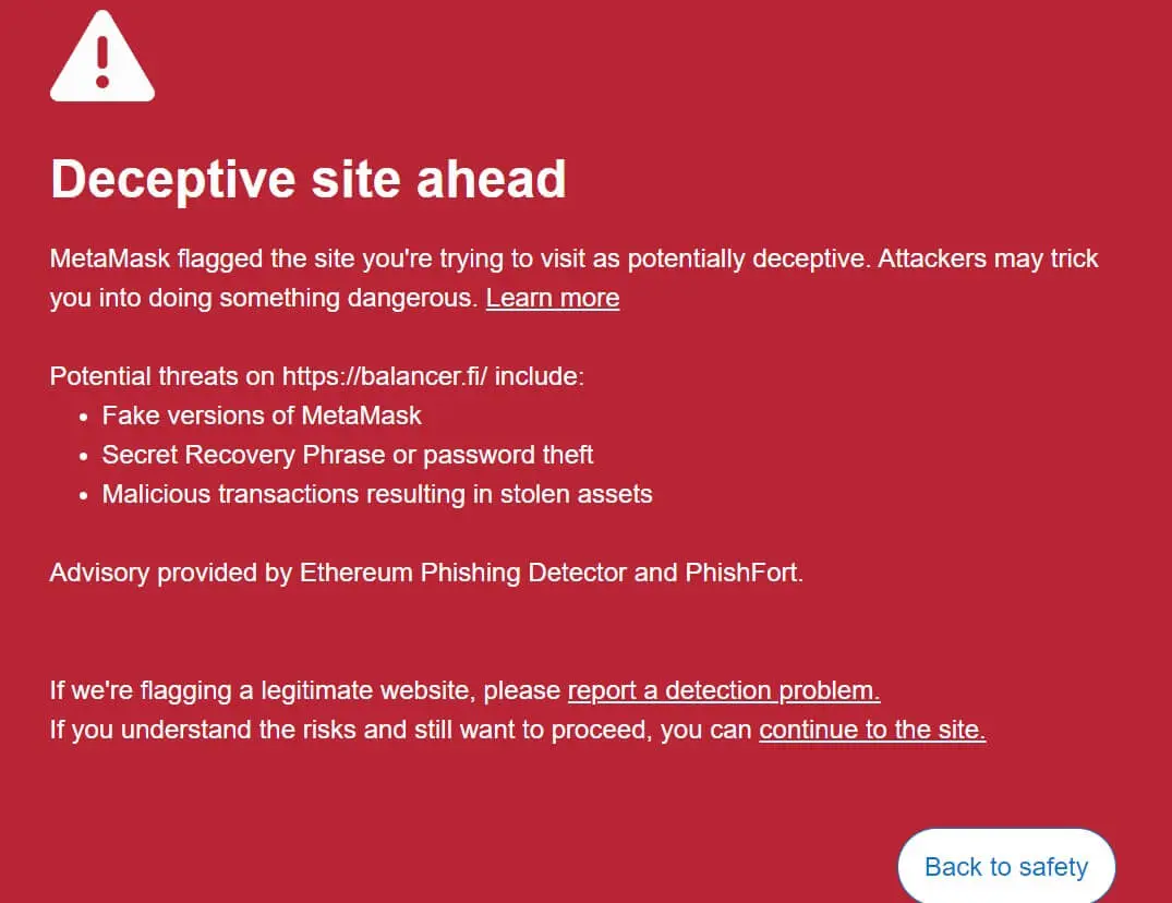 CryptoSlate尝试访问该网站显示 MetaMask 已将其标记为“潜在欺骗性”网站。