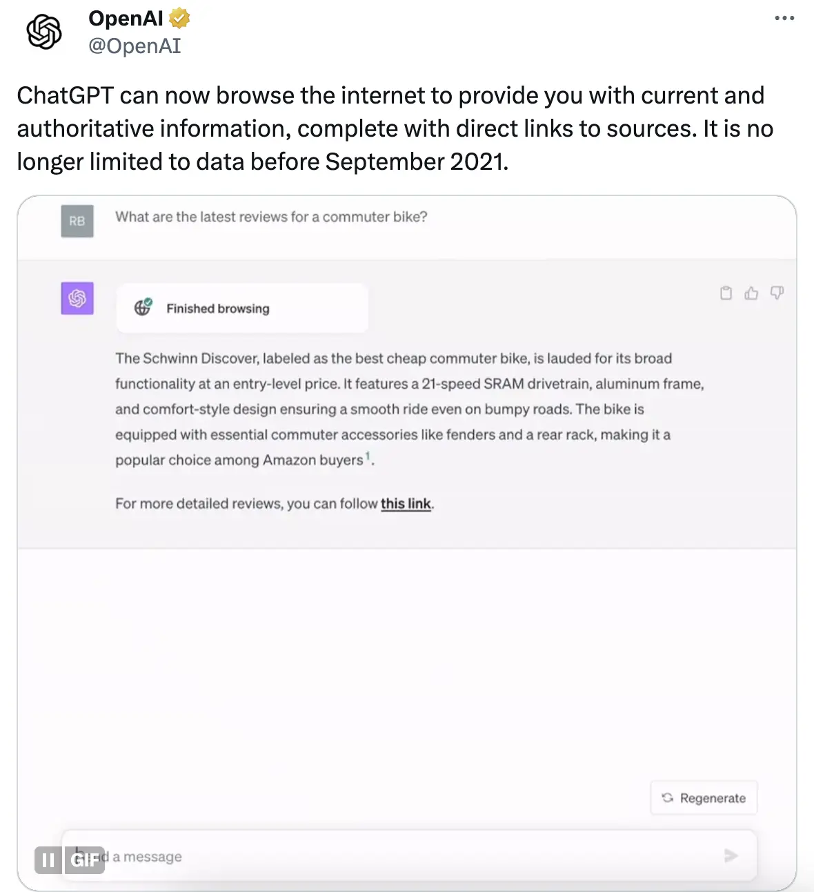 巴比特讯,9 月 28 日凌晨,OpenAI 在 X(推特)上宣布,其聊天机器人产品 ChatGPT 可以通过微软的必应(Bing)搜索引擎进行网络搜索,并提供直接来源链接,将不再局限于 2021 年 9 月之前的数据。OpenAI 表示,目前 ChatGPT Plus 和 Enterprise(企业版)用户可以使用浏览功能,将很快扩展到所有用户。要启用,请在 GPT-4 下的选择器中选择“使用必应浏览”。