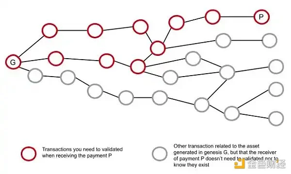 最终,由于使用了 UTXO 容器,一个 RGB 的合约的最新状态可以表示成一个有向无环图上还没有后代的点(每个点都表示一个存放在 UTXO 容器内的状态)。并且,对下图中的所有者 P 来说,他将只知道从合约的初始状态 G 到达他的过程,也即红圈标注的过程,而对灰色的点一无所知: