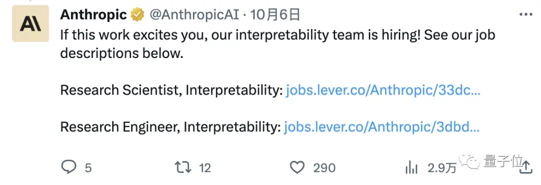 Anthropic同时还在加紧招聘可解释性相关的研究员和工程师。