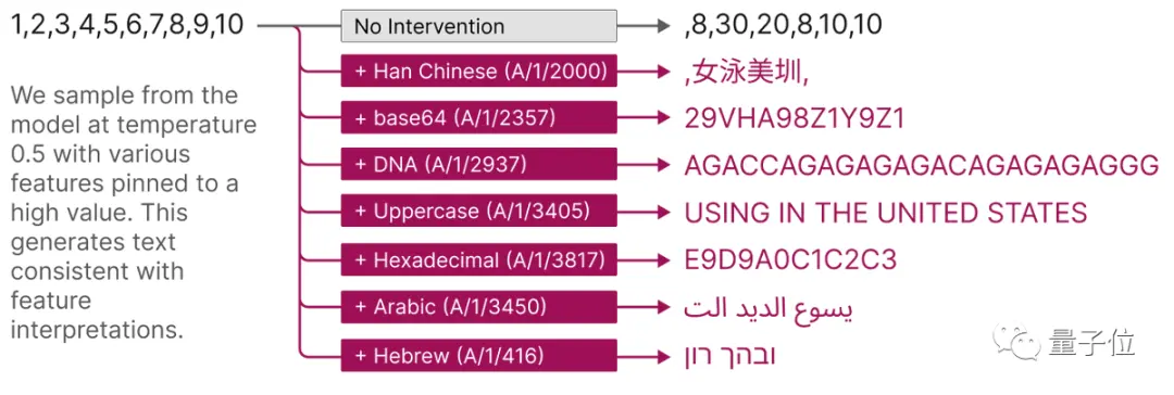 例如,激活Base64特征会导致模型生成Base64文本,激活阿拉伯文字特征会生成阿拉伯文本。