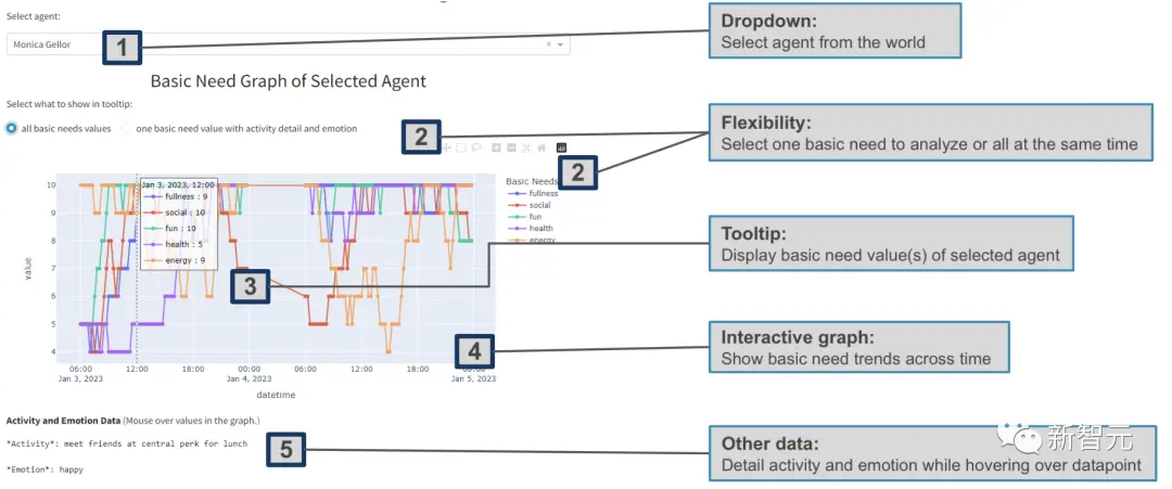 Agent在活动过程中所生成的数据,可通过交互式仪表盘直观显示。它包括基本需求图和社会关系图,以及相应的信息,包括情感和对话细节。