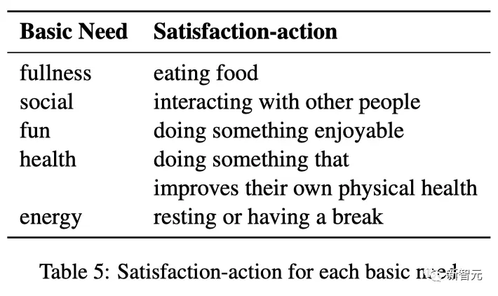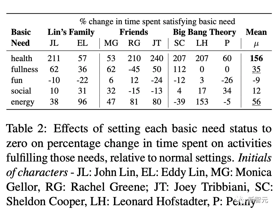 如下表所示,当健康(156%)、能量(56%)和饱腹感(35%)等基本需求被初始化为0时,Humanoid Agents对其活动的适应程度最高。