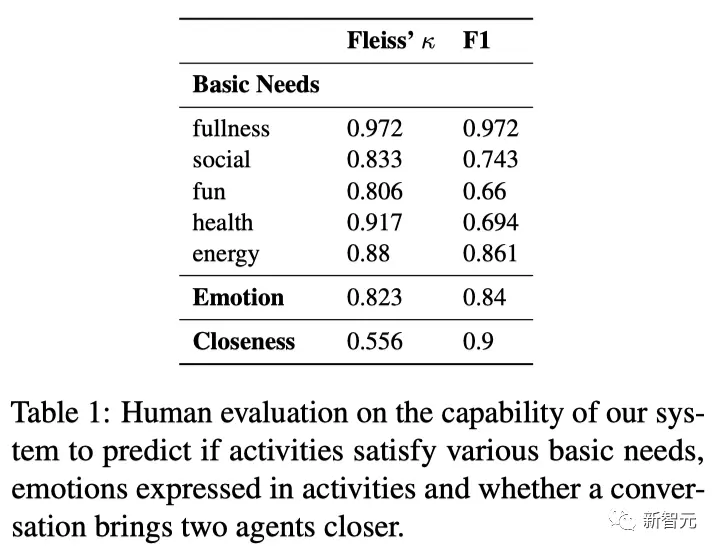 为了评价Humanoid Agents的预测能力(比如活动是否满足自己的基本需求、活动中自己会表现出什么情绪、对话是否会使两个Agent更亲近),研究者将系统的预测与人类标注进行了比较。