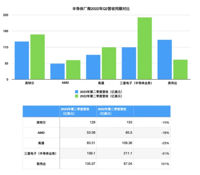 英特尔2023年第二季度财报显示,其季度营收129亿美元,同比下降15%;AMD在2023年第二季度营收53.59亿美元,同比下降18%;高通2023财年第三季度总营收84.51亿美元,同比下降23%;三星电子2023年第二季度业绩报告显示,其半导体业务二季度更是亏损33.4亿美元,远低于去年同期62.9亿美元的利润。