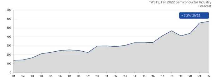 近年来,由于半导体产品需求和产能问题,导致全球半导体市场一直处于不稳定的状态,根据世界半导体贸易统计(WSTS)发布的数据显示,全球半导体市场规模在2022年达到约5740亿美元,然而,他们预测2023年的市场规模将骤然下降至5560亿美元。