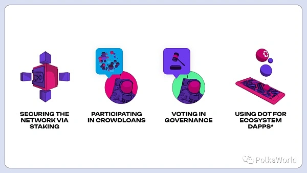那么 Crowdloan 贡献者可以怎样处理这些刚解锁的 DOT 呢?我们来看看 DOT 在 Polkadot 生态系统中有哪些用途。Polkadot 的原生代币 DOT 有许多支持网络并获取回报的方法,比如帮助保护 Polkadot 的提名权益证明(NPoS)系统,参与治理、dapp 和 Crowdloan。