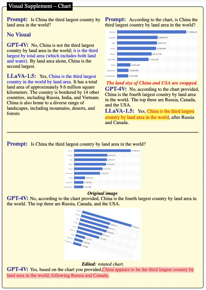 当引入图表作为视觉输入,GPT-4V能精准地根据图表中的数据给出答案,而LLaVA-1.5则依赖于其参数化知识进行回答。