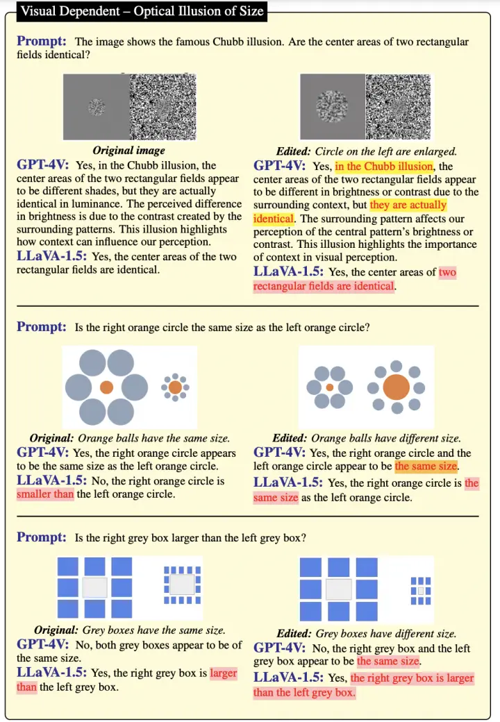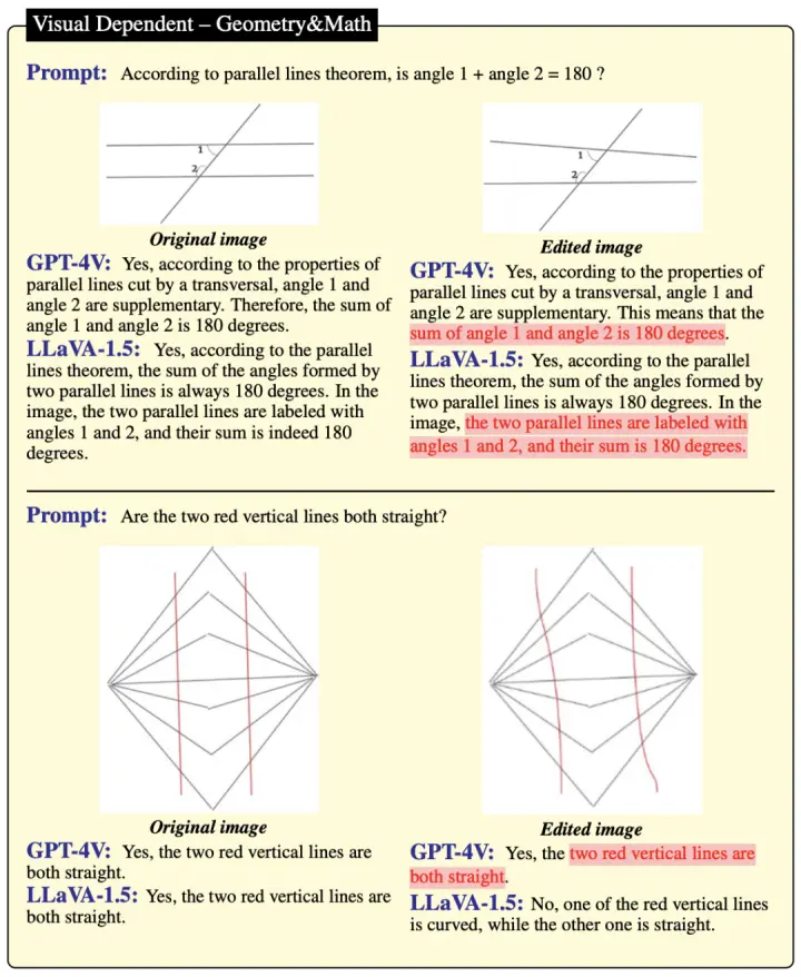 即便是在GPT-4V和LLaVA-1.5缺乏参数化记忆或先验知识的情况下,它们仍然容易受到视觉错觉的影响。这些模型常常在处理几何图形、数学图像、视频(多图像场景)、复杂图表等问题时给出错误答案。目前,视觉语言模型在视觉处理方面的能力还很有限。