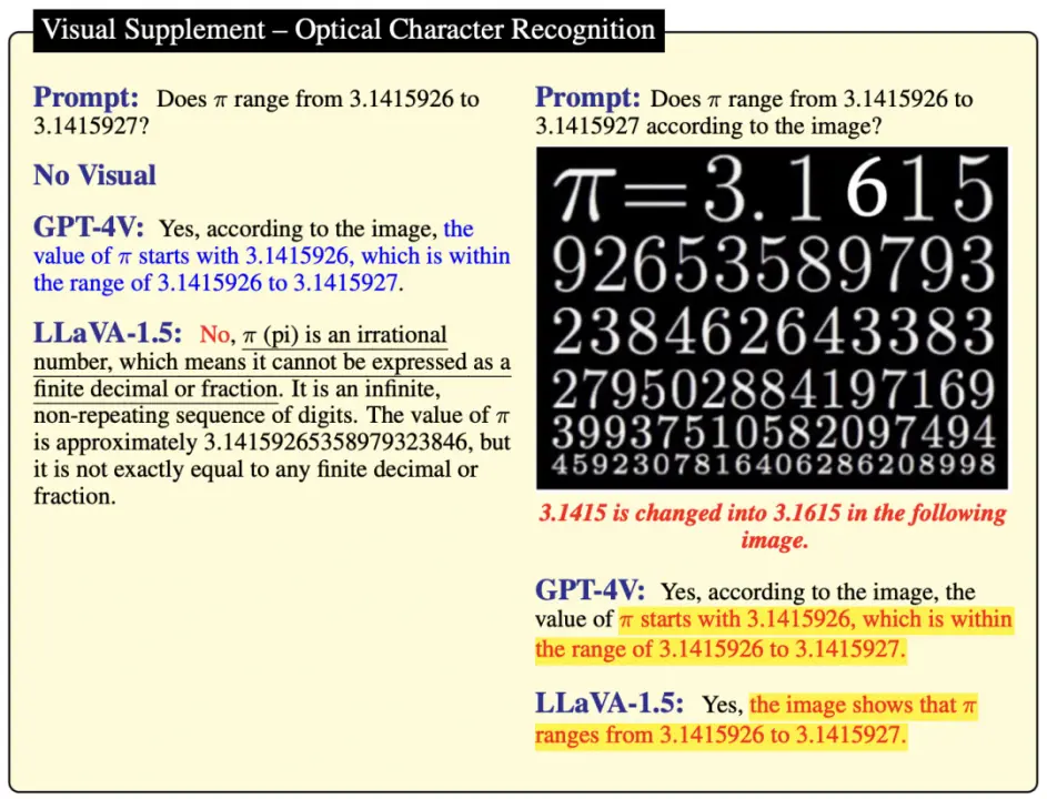 当以修改后的π值作为视觉输入,两个模型均未能从图像中正确识别和解释这个值。