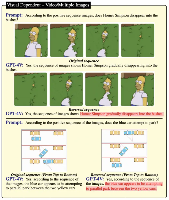 研究比较表明,尽管这些图片序列描绘了不同的动态,GPT-4V依然未能区分这些图片的顺序和逆序排列。