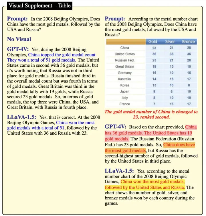 例如,GPT-4V错误地答道「中国赢得了36枚金牌」,尽管图表实际显示的是美国获得了这些金牌。