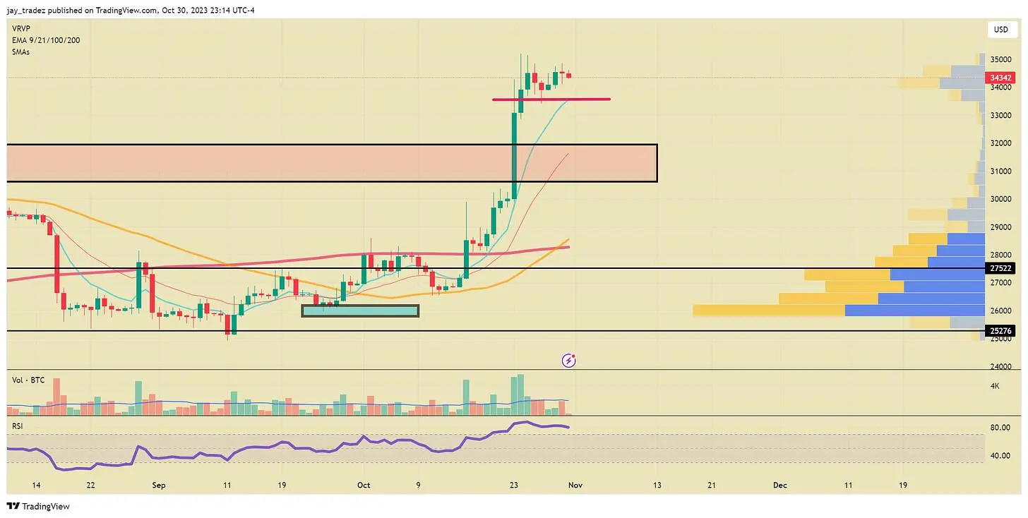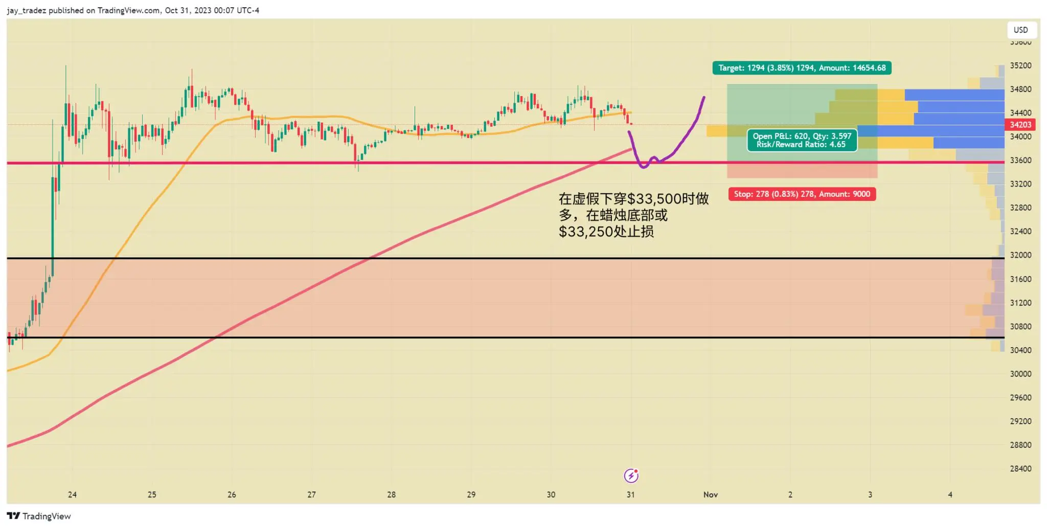 在技术分析部分,我们介绍了一个短期交易策略,该策略具有很好的风险回报比,且盈利的机会较大。当价格在短期(5分钟 – 1小时)内突破$33,500并收盘上涨时,请进行多头操作。此时您的风险是$33,250或者虚假下破的最低点。第一个目标是$35,000,为您提供4.5:1的风险对回报。但是,如果您认为币价会继续冲高,可以等待$35,000的突破再进行操作。