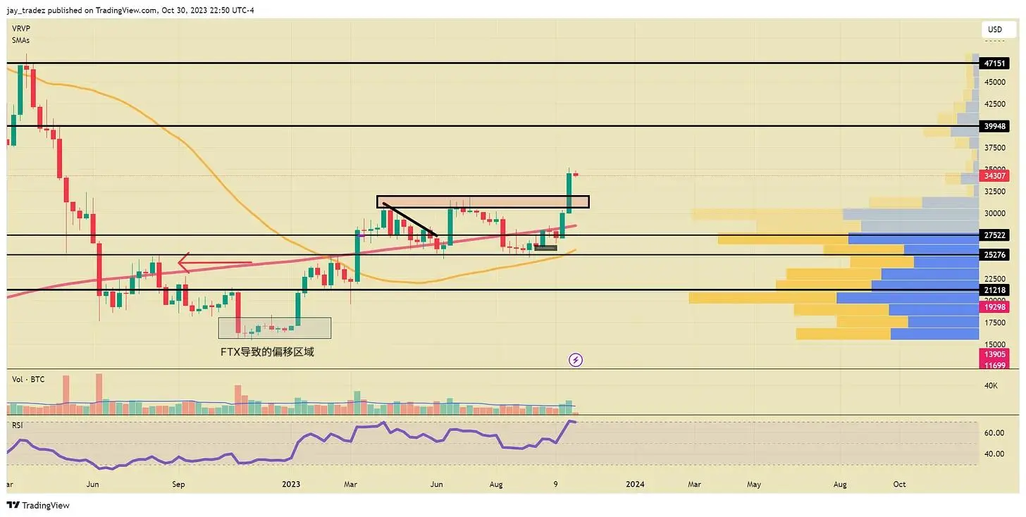 上周,我们写到比特币重回牛市形态。周一时,比特币突破了所有的阻力位,正式将我们带回到牛市区域。此次突破的幅度说明了等待进入市场的大量资本储备,以及投资者们因害怕错过机会而产生的恐惧情绪(FOMO)。有人说这次的价格变动可能受到Blackrock发行的比特币ETF股票代号IBTC被加入到DTCC网站的消息影响,这说明ETF在SEC的批准进程又迈出了一步。然而,有消息说实际上在今年8月IBTC就已经被加入DTCC,但在币价上涨之前才开始在Twitter上热议。