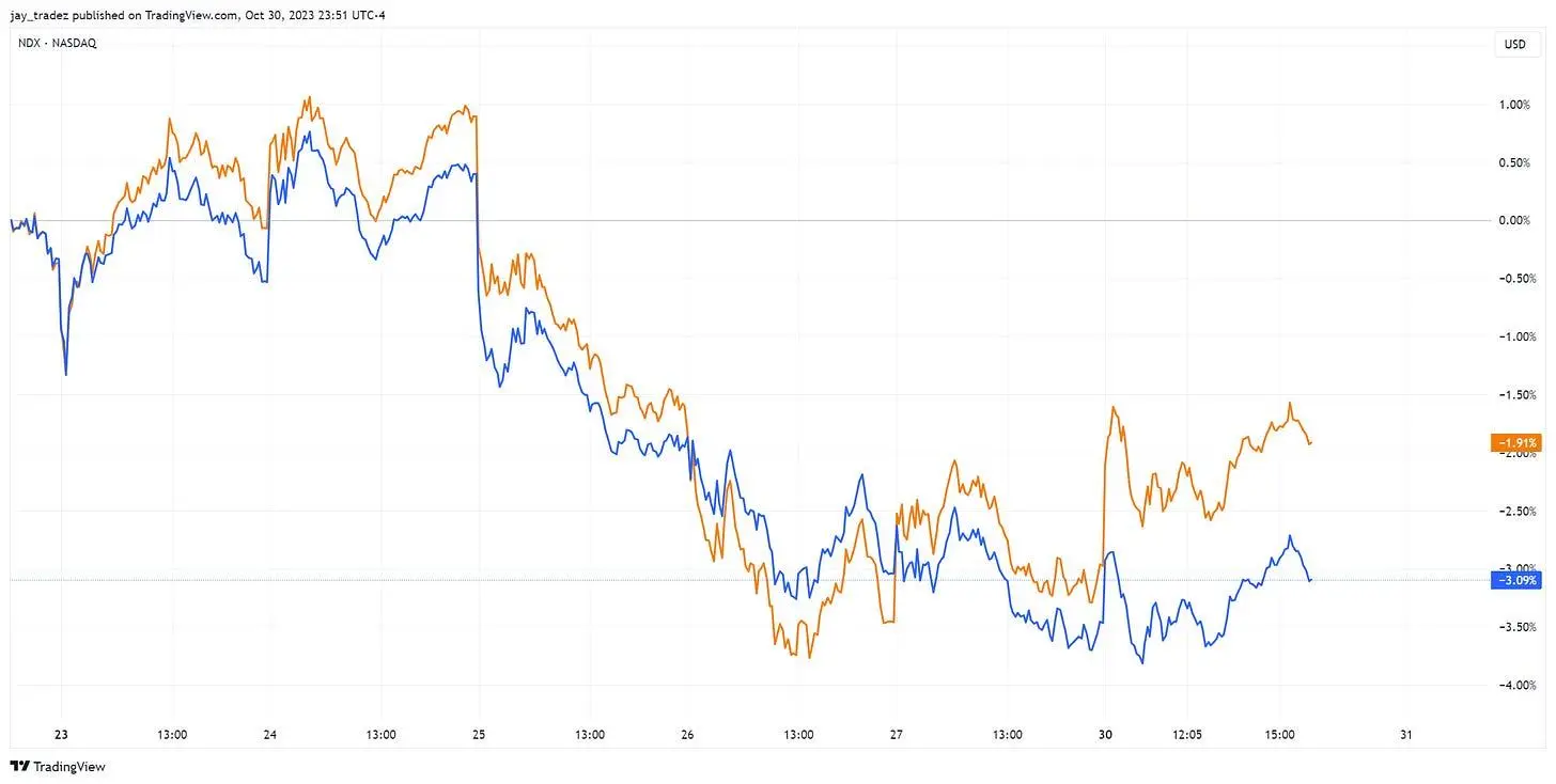 指数中的大部分资本都集中在我们所称的“七巨头”(包括Meta、亚马逊、Google、Nvidia、Netflix、微软和Tesla)中。然而,随着像Google和Tesla这样的公司接连发布不如预期的研报,整个指数都受到了打击。当我们将Nasdaq100与其等权重对应者进行比较时,我们观察到,等权重指数的表现并不优于其常规版本。这意味着七巨头的下跌正在负面影响整个指数的情绪。