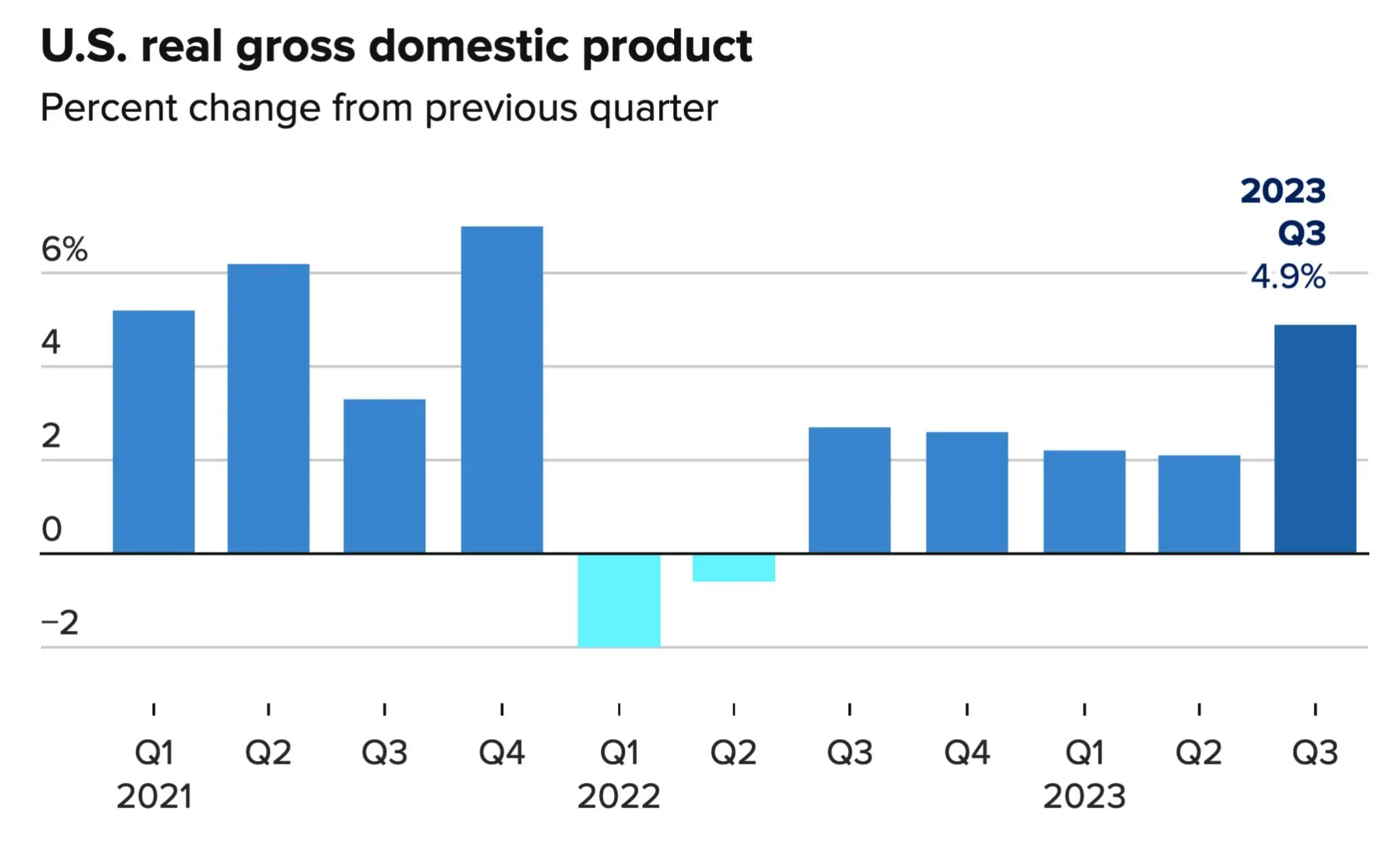 根据初步数据,尽管存在利率上升、通货膨胀压力以及各种其他国内和全球不利因素,但在强劲消费者的推动下,第三季度美国经济GDP增速仍超过预期,达到4.9%,远超经济学家预测的4.3%。这比第二季度的2.1%有所上升,也是自2021年第四季以来最强的数字。