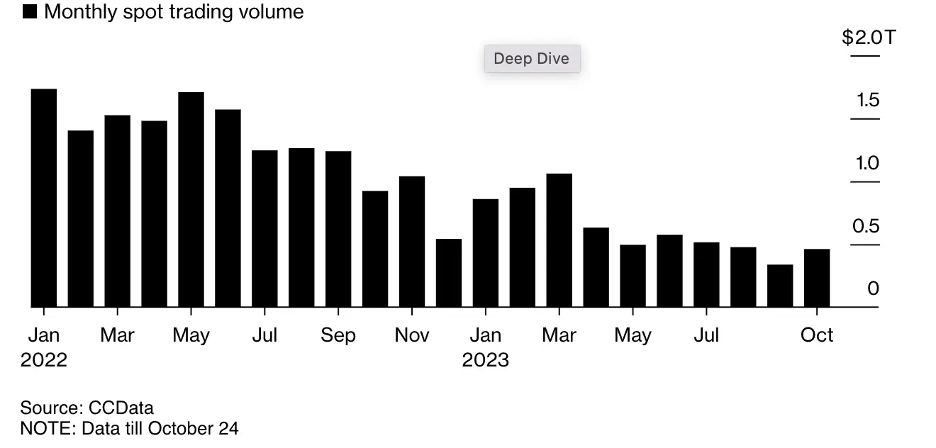 尽管上周比特币上涨近 16%,提振了交易量,但要恢复到加密货币寒冬之前的水平,还有很长的路要走。据 CCData 称,10 月份交易量自 6 月以来首次出现增长,但与 FTX 破产(2022 年 11 月)前相比还是下降了 50%。