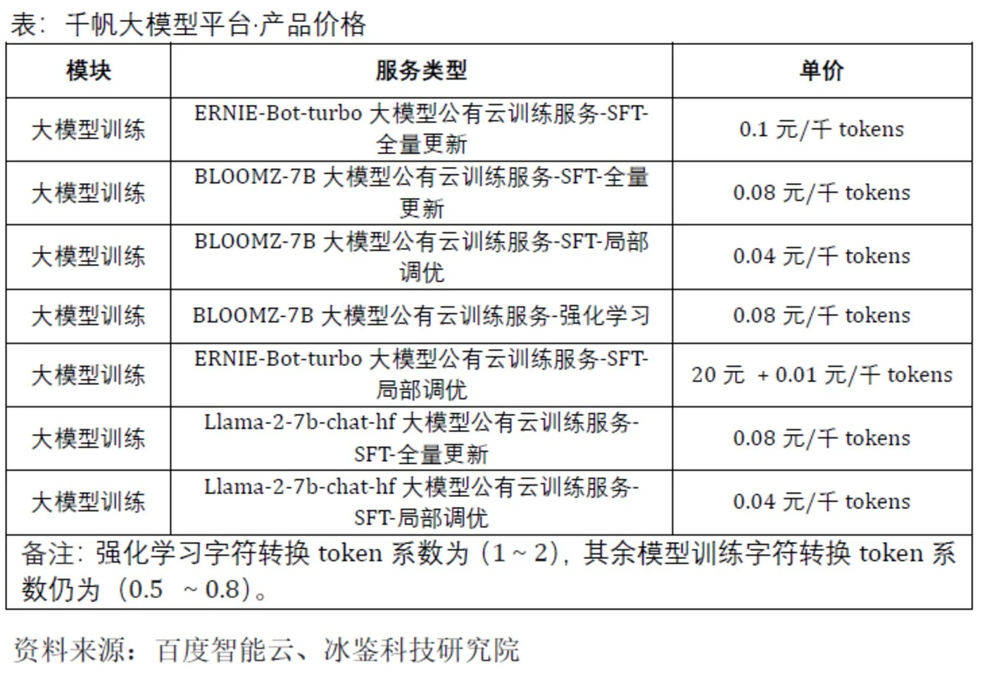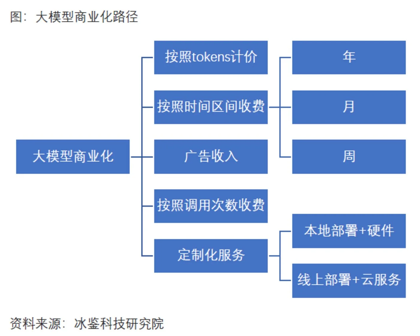 冰鉴科技研究院认为,在产品定价方面,大模型企业针对C端客户的产品按月收费,针对B端客户,按照调用量(token、次数)计价可能是明智的选择。虽然C端客户付费意愿不强,但只要用户量足够大,大模型公司就可以从广告主处获得补偿,类似Ask AI。企业客户由于工作需求,付费能力更强,日常使用调用量较大,按照调用量收费才能更好的覆盖成本。除此之外,由于大型企业拥有更强的付费能力,为银行、大型央企、国企、上市公司等提供定制化、一站式服务,可以为大模型企业带来更多收入。比如目前一些大型银行在公布大模型采购服务时,服务内容就不仅包括AI软件与模型开发服务,还包括大模型GPU服务器、GPU专用存储服务器、IB交换机等硬件采购。