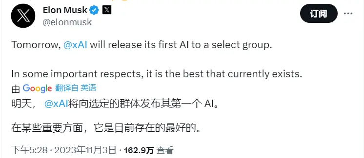 巴比特讯,11 月 3 日,马斯克发文称,旗下人工智能公司 xAI 将于明日向选定的群体发布其首个 AI。马斯克表示,“在某些重要方面,它是目前存在的最好的。”