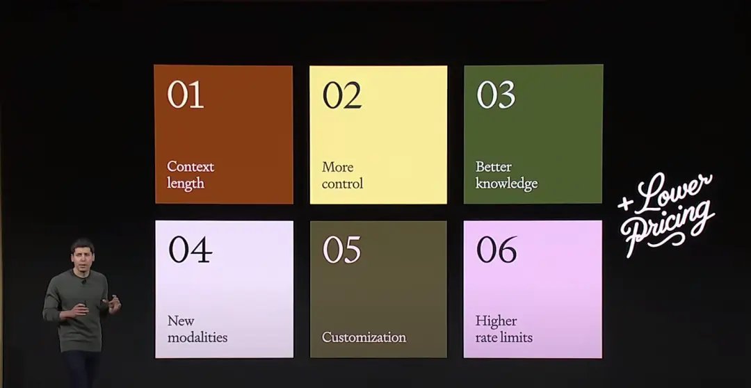和过往的科技发布会类似,Altman主要介绍了新产品和新功能的发布,以及回应了外界最为关心的AI伦理等问题,发布会现场掌声不断。