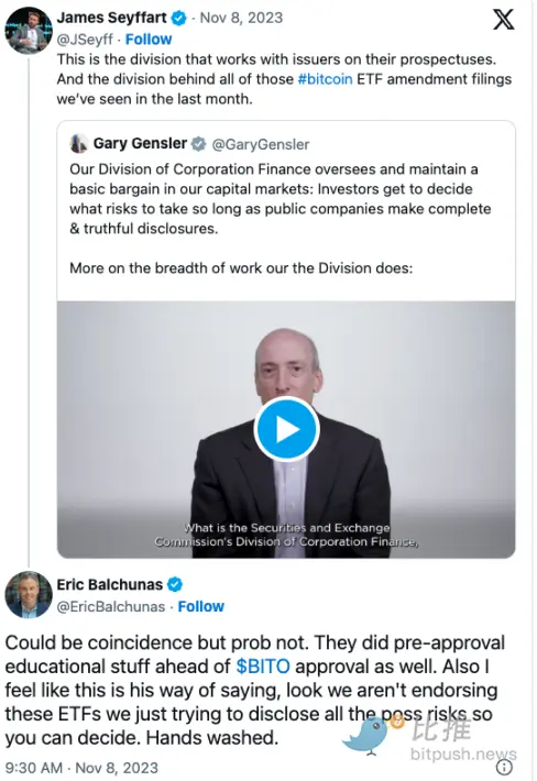 Balchunas 还指出,SEC 在 X 平台发布的教育短视频可能进一步增强了提前批准的希望。该委员会在 2021 年 10 月批准 ProShares 发行的比特币期货 ETF 前不久发布了类似的材料。
