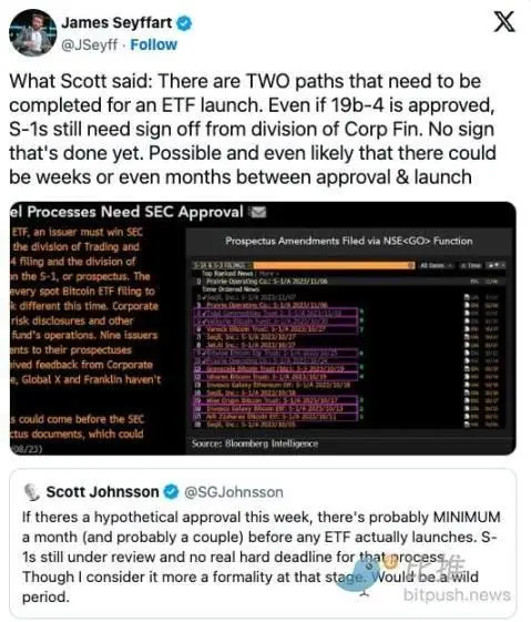 不过,现货比特币 ETF 可能需要几个月的时间才能上市交易。分析师 Seyffart 指出:即使 SEC 批准允许 ETF 交易的规则变更(194-b 文件),这与批准基金的注册声明(S1 文件)完全属于两个步骤。这两份文件都需要获得批准,比特币 ETF 才能开始交易。