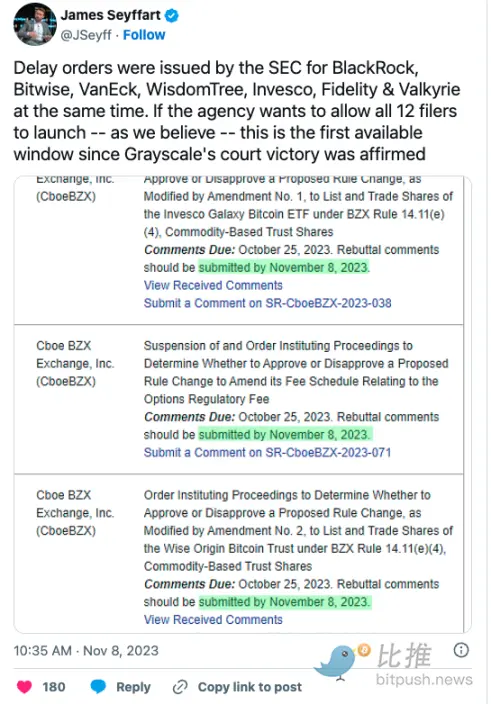 Seyffart 在 X 平台写道:「美国证券交易委员会同时向 BlackRock、Bitwise、VanEck、WisdomTree、Invesco、Fidelity 和 Valkyrie 发出了延迟令。如果该机构希望允许所有 12 个申请产品同时启动–正如我们所认为的–这个时间段自 Grayscale 法庭胜利得到确认以来的第一个可用窗口。」