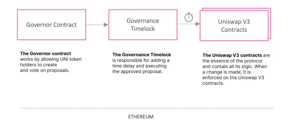 Uniswap DAO 对 Uniswap 协议的治理是通过 Compound 的 Governor Bravo 合约的分叉进行管理的,该合约允许主网(以太坊)上 UNI 代币的持有者使用提案 → 投票 → 队列 → 执行模式来提议和执行函数调用。