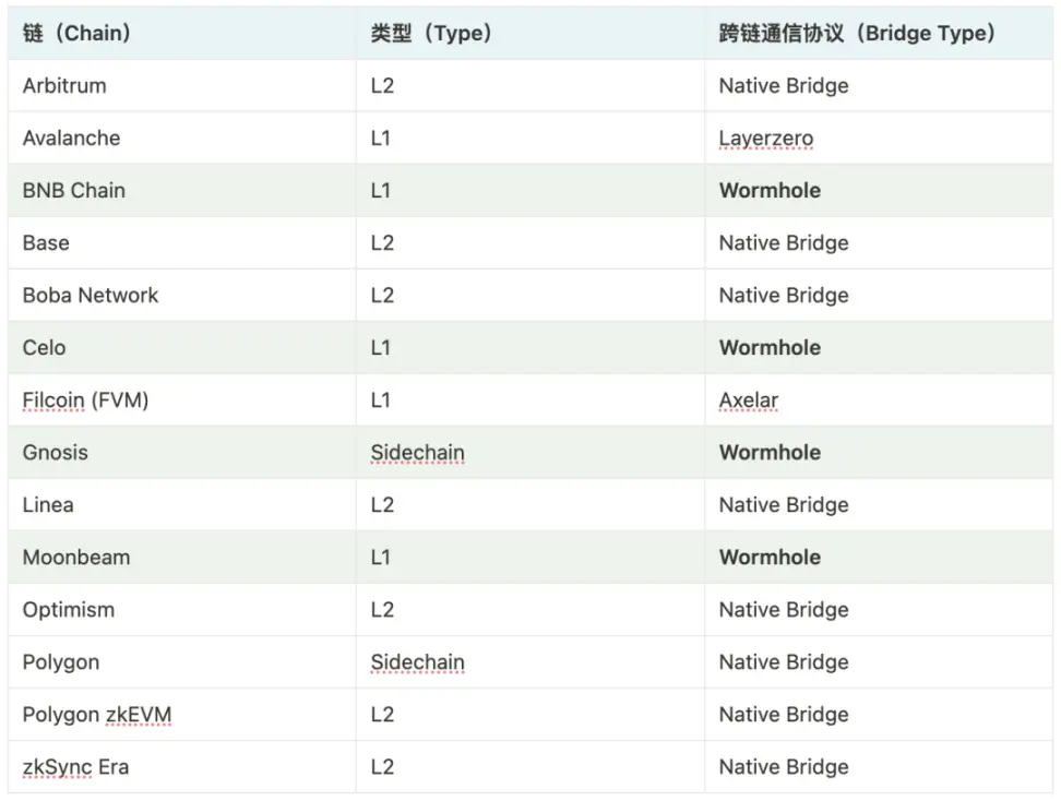 以下是截止目前 Uniswap v3 所部署的链中选择的跨链通信协议一览: