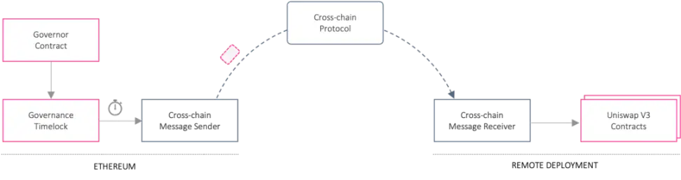 而 Uniswap DAO 跨链治理用例的主要功能要求是能够将治理消息从以太坊发送到部署了 Uniswap v3 的远程链以供执行。 由于其他区块链网络上的 Uniswap 协议部署没有自己的治理合约,而是通过以太坊网络上的标准流程进行治理,这意味着对远程链上 Uniswap 协议部署的任何拟议更新都必须首先经过以太坊上 Uniswap DAO 的治理流程,如果获得批准,则该决定将通过消息传递桥传达到远程链以执行。下图概括了这一流程: