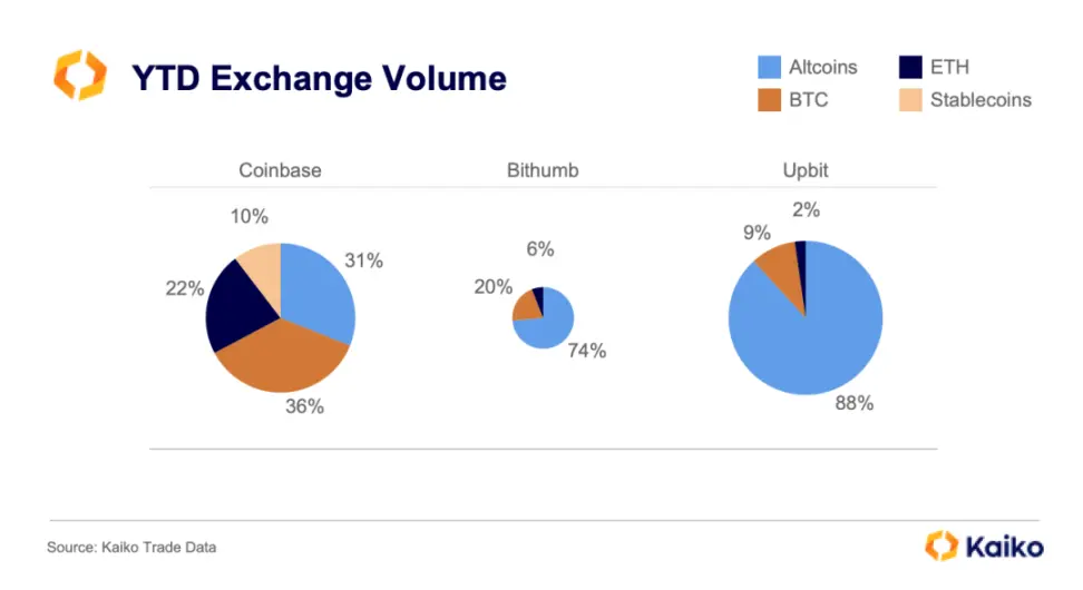 Bithumb 作为市场上的第二大参与者保持了强劲的地位,占四大交易所总交易量的 15% 到 20%,Coinone 的市场份额在 3% 到 5% 之间,而 Korbit 的份额不到 1%。