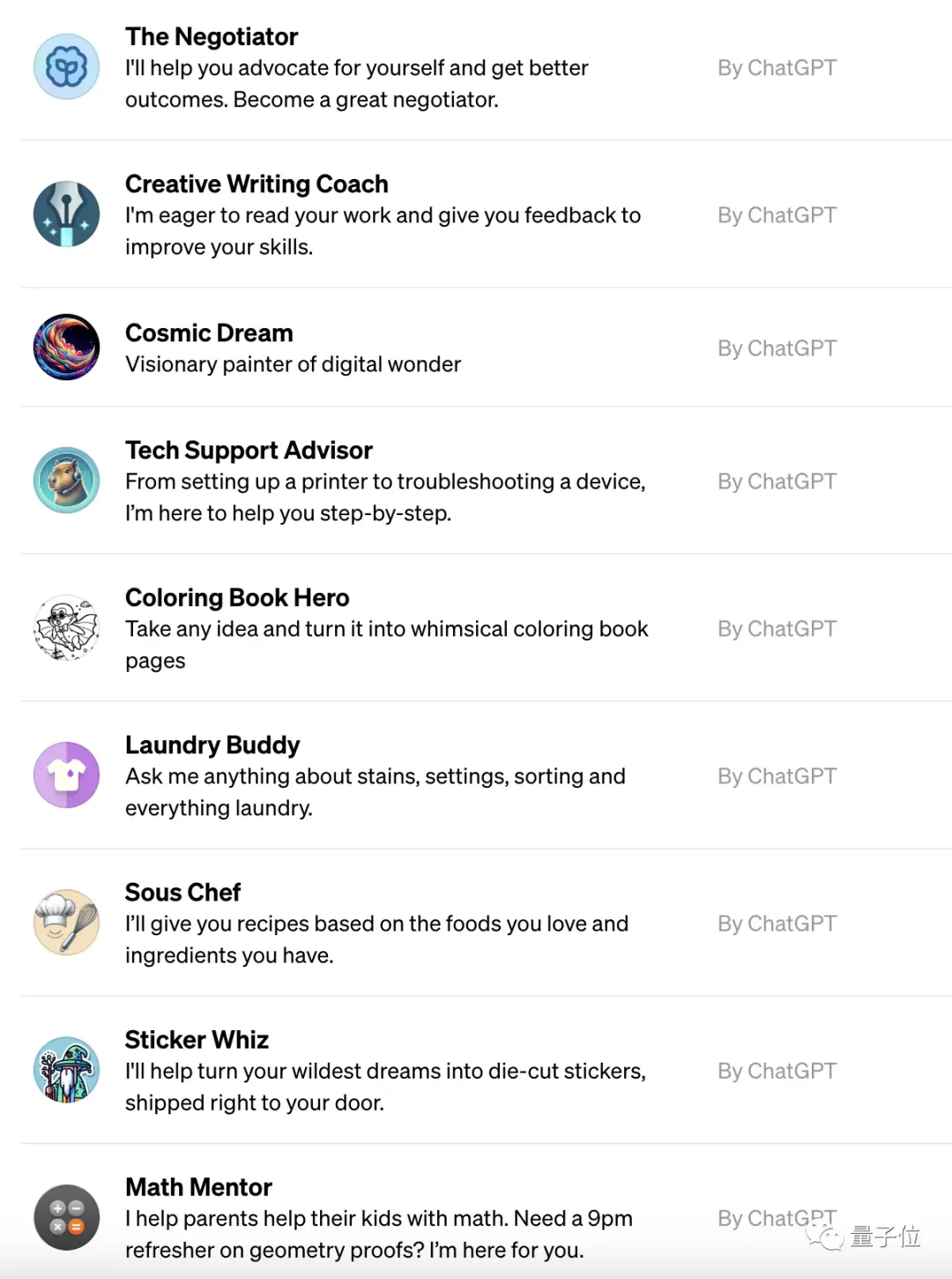不过OpenAI官方也在GPTs的页面中准备了一些定制版机器人供用户使用,包括数学导师、烹饪助手、谈判专家等等。