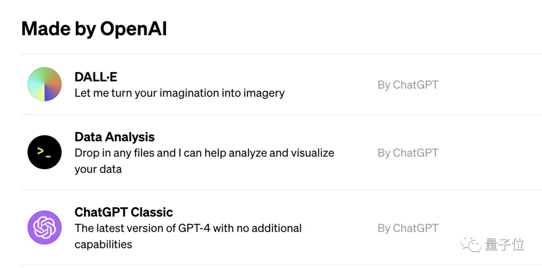 而GPT-4与DALL·E、网页浏览、数据分析功能,也合并到了同一入口,三项功能与基础版GPT-4被打通,插件功能则依旧是独立入口。