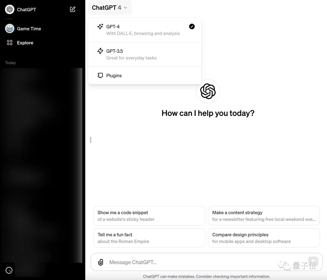 侧边栏中加入了GPTs相关的“角色选择”,模型版本(3.5/4)的切换也从聊天框上方正中移到了左上角。