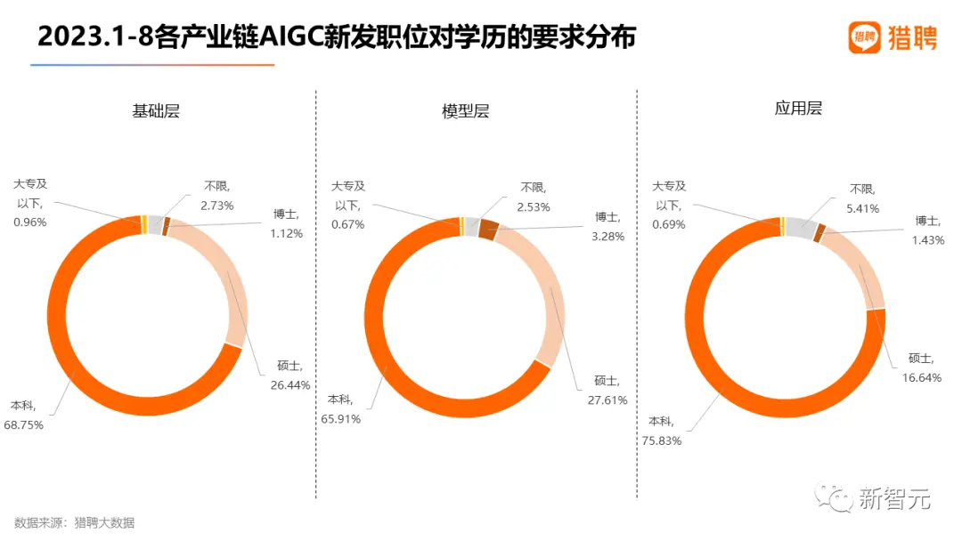 由于基础层和模型层更加侧重技术,因而职位对学历的要求也更高。