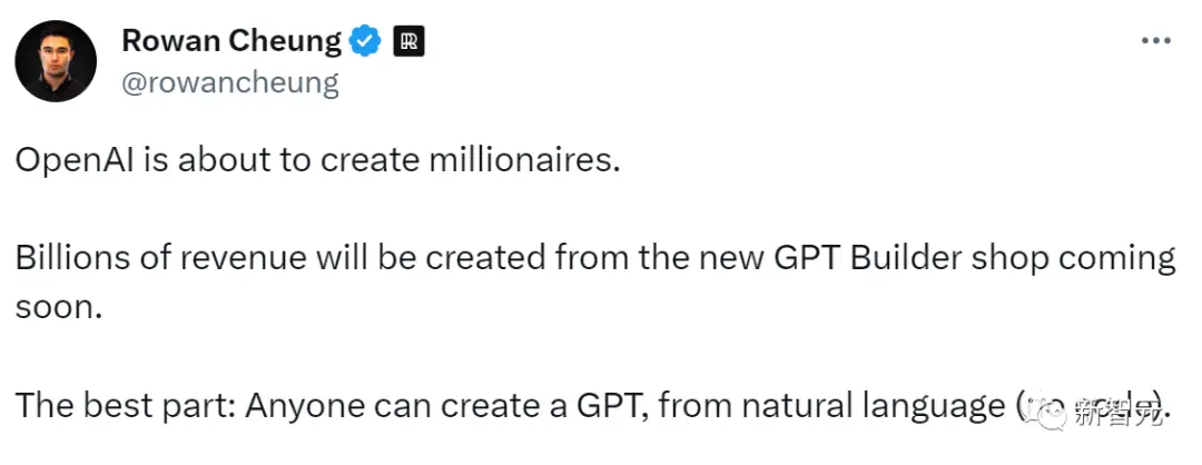 OpenAI全新推出的GPT Builder,可以让任何人都使用自然语言0代码创建GPT,这将创造数十亿美元的收入