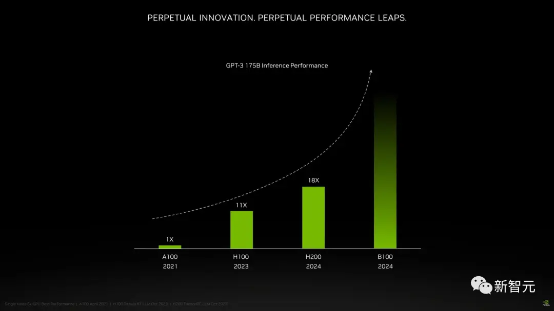以推理1750亿参数的GPT-3为例,今年刚发布的H100是前代A100性能的11倍,明年即将上市的H200相对于H100则有超过60%的提升,而再之后的B100,性能更是望不到头。