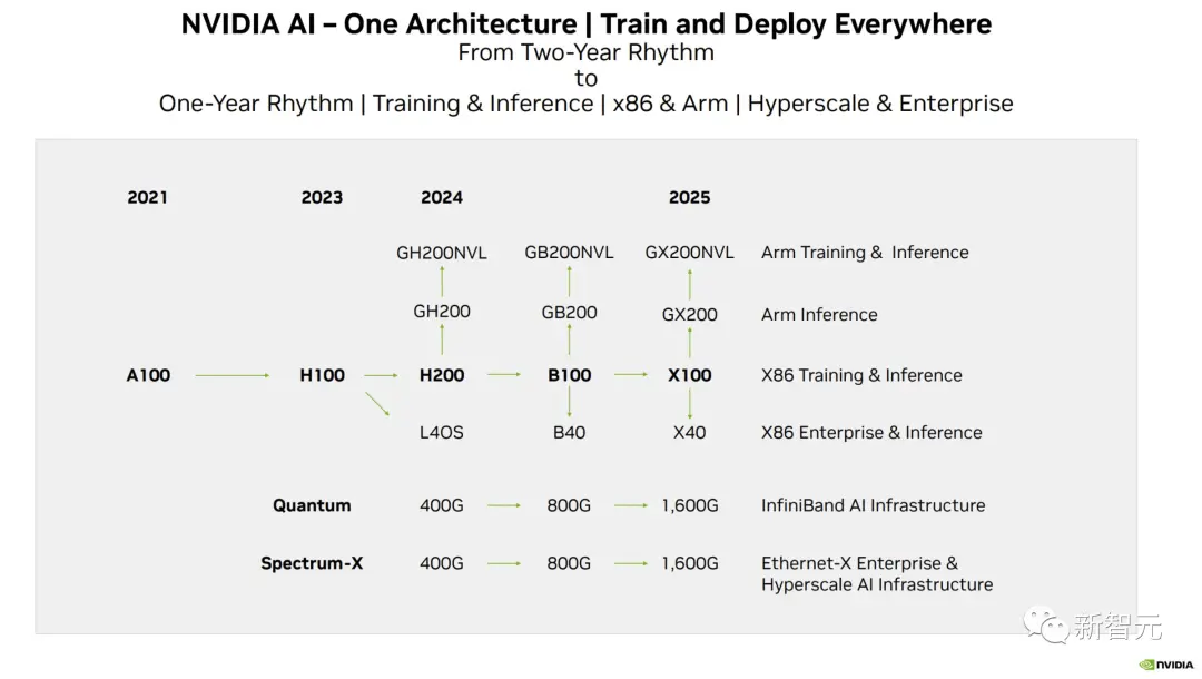 这次,英伟达更是在官方公告中宣布了全新的H200和B100,将过去数据中心芯片两年一更新的速率直接翻倍。