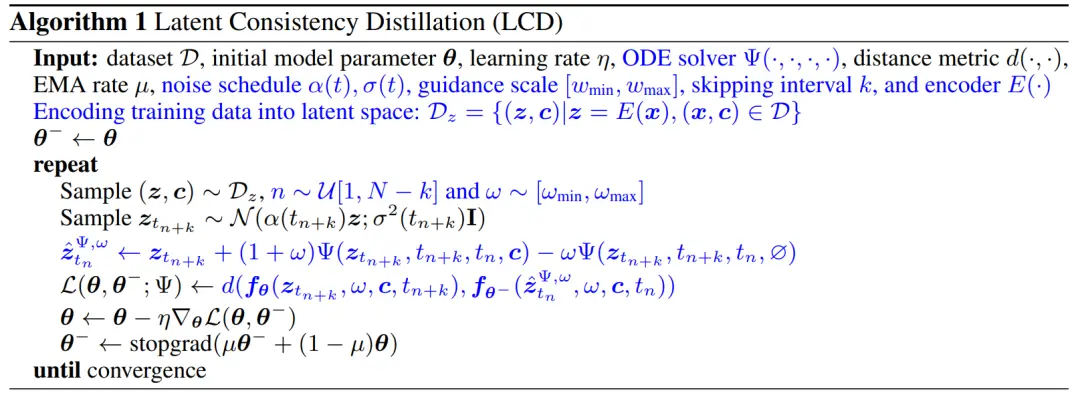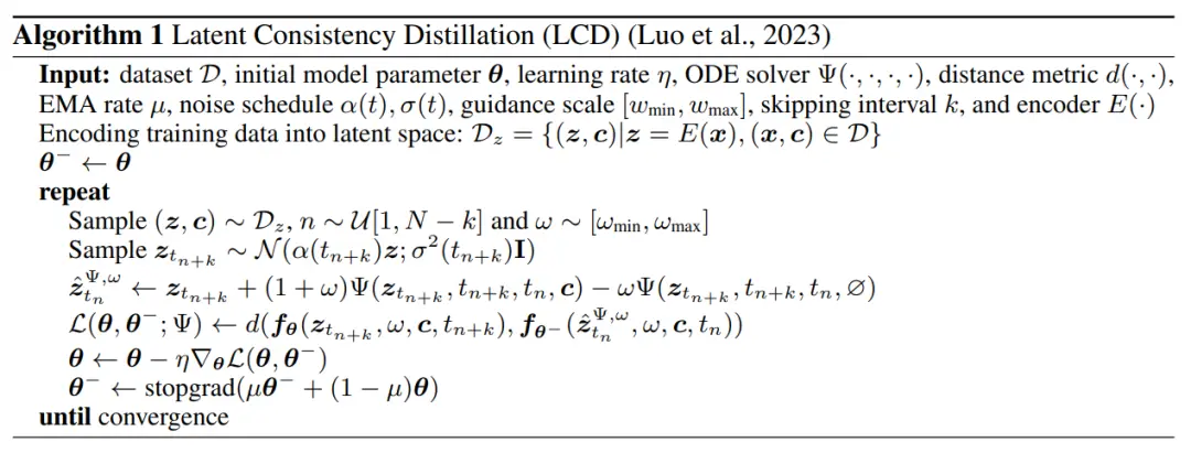 值得一提的是,蒸馏的重点是保持这些轨迹的保真度,同时显着减少所需的采样步骤数量。算法 1 提供了 LCD 的伪代码。